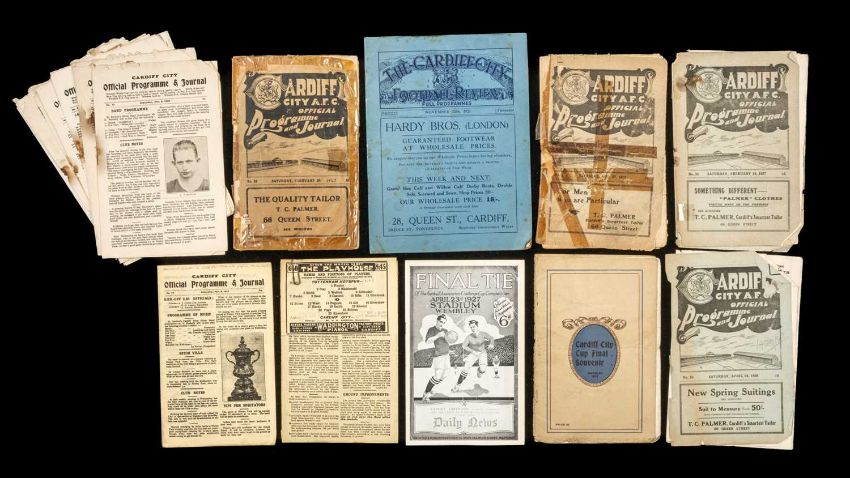 THE FOOTBALL CLUB HOUSE: CARDIFF CITY PROGRAMMES FROM 1920s, to include Cardiff City Football Review dated November 12th 1921 together with programmes: Cardiff City vs. Tottenham Hotspur dated February 24th 1923 (tape to edges, creased and some tears), Cardiff City vs. Bolton Wanderers dated August 27th 1927, Cardiff City vs. Cardiff & District League 11, dated February 19th 1927, Cardiff City vs. Penrhiwceiber dated April 14th 1928; along with number of facsimile copies of programmes of same dates; Cardiff City Cup Final souvenir from Cardiff City vs. Sheffield United at Wembley 1925 (includes photographs and details of gameplay) and facsimile copy of FA Final tie from April 3rd 1927Provenance: the collection of the former BBC Wales football commentator Richard Shepherd. Richard Shepherd was born in Porthcawl in 1944. He started watching football as a young lad, and then after being in the legal profession, began reporting and commentating on the sport for BBC Wales, starting in the early 1970s and doing so for over 25 years. He then did radio commentary and then worked on Cardiff City's matches commentating on their internet station. It is thought that Richard has attended over 4000 professional football matches in his lifetime. Between matches he also found time to write including biographies and published books on the history of Swansea City, Cardiff City and Newport County.Comments: viewing recommended