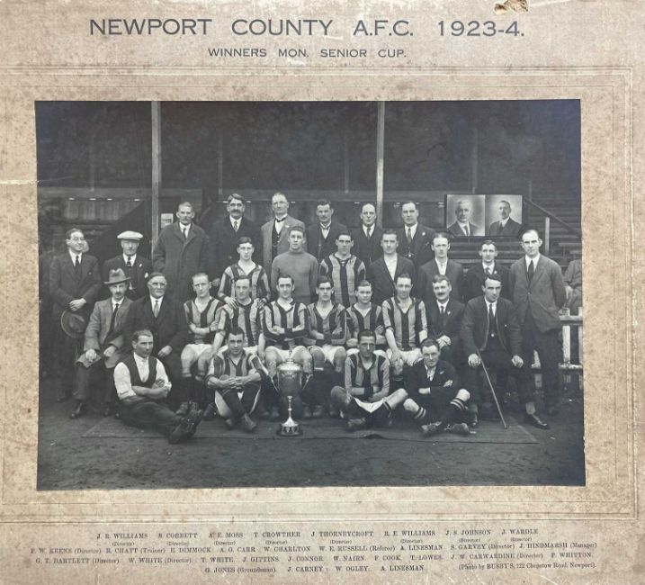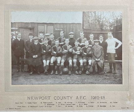 THE FOOTBALL CLUB HOUSE: NINE VINTAGE NEWPORT COUNTY PRESS PHOTOGRAPHS, first team 1906-1907, 1910-11, Newport County AFC and Supporters and Officials 1912-13, 2x Winners Mon. Senior Cup 1923-4, 1924-25, 1933-34, 1956-57, and manager Bill Lucas with Bell's Whisky Manager of the Month award Feb 1973 (9)Provenance: consigned by Welsh vendor to benefit charity.Comments: all but one unframed/mounted on card, generally poor to fair condition, some better, inspection advised.