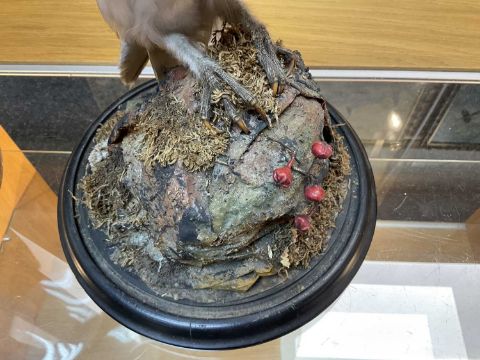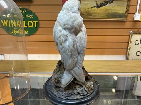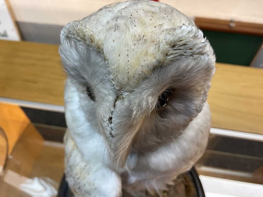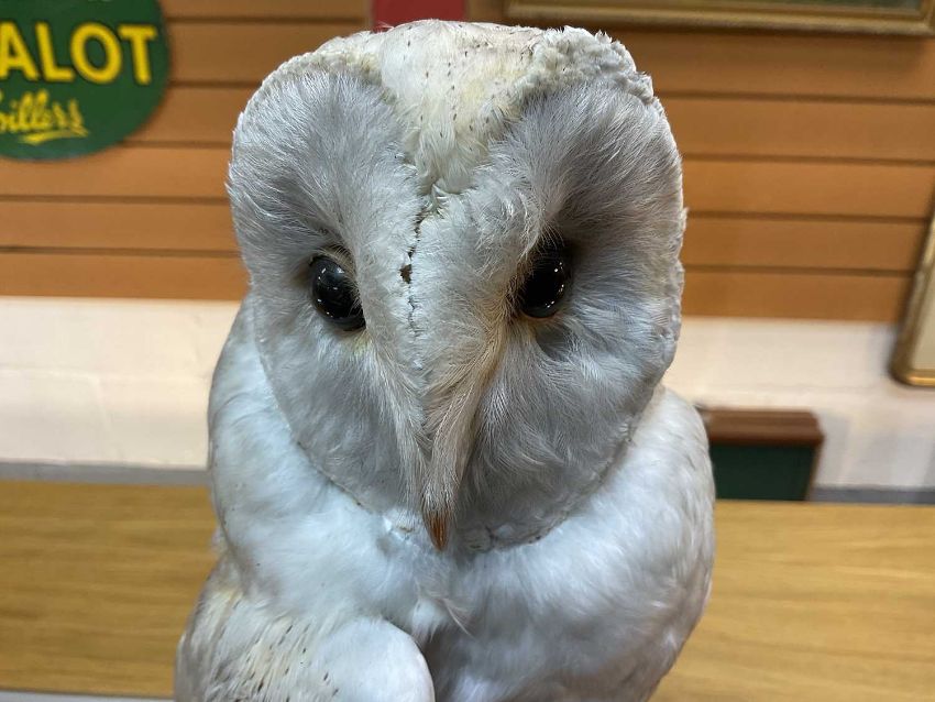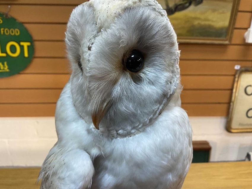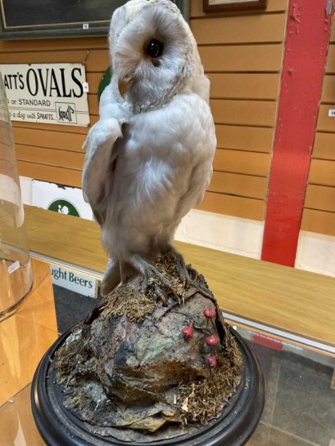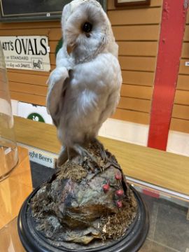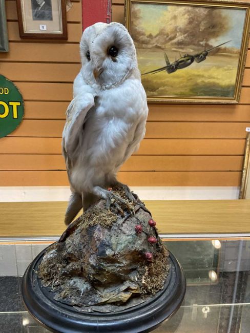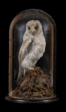 THE NATURAL HISTORY CLUB HOUSE: ANTIQUE TAXIDERMY BARN OWL Tyto alba, perched on stump and rockwork, under circular section glass dome, ebonised base, 46cms (h)Provenance: private collection Vale of Glamorgan, same ownership since 1984, pre-1947 specimen.