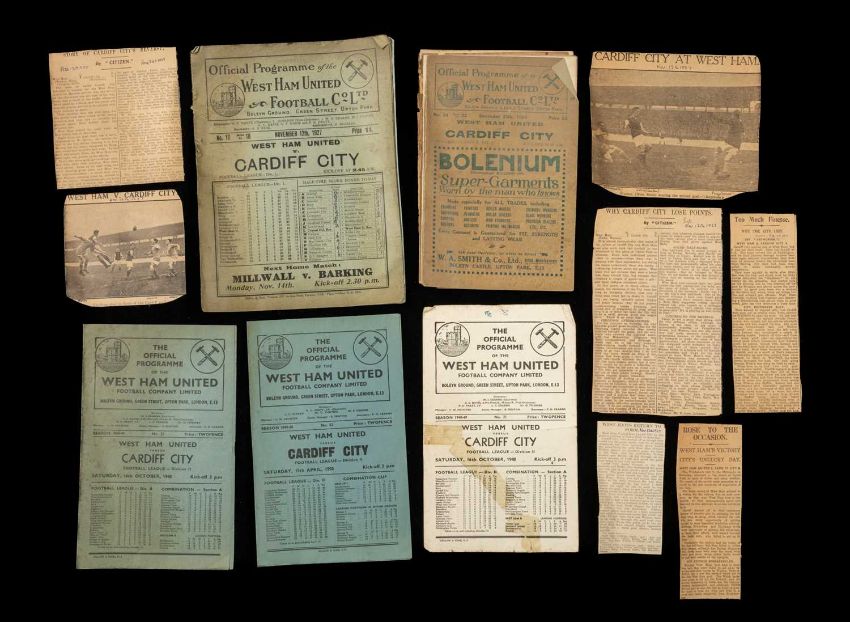 THE FOOTBALL CLUB HOUSE: SIX EARLY WEST HAM & CARDIFF CITY PROGRAMMES, West Ham vs. Cardiff City dated December 25th 1924, West Ham vs. Cardiff City dated August 31st 1925, West Ham vs. Cardiff City dated November 12th 1927, West Ham vs. Cardiff City dated April 21st 1928, West Ham vs. Cardiff City October 16th 1948, West Ham vs. Cardiff City dated April 15th 1950Provenance: the collection of the former BBC Wales football commentator Richard Shepherd, please see lot 175 for further detailsComments: all showing staining, some with torn edges and split spines, all complete and present, viewing recommended