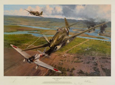 ‡ MILITARY / AVIATION CLUB HOUSE: ROBERT TAYLOR (British b.1946) limited edition (ap 3/25) colour lithograph - 'America Strikes Back', American Tomahawk and Japanese fighter dogfighting, signed and numbered in pencil with six other pilot's signatures in margin, (I) 40 x 61cmsProvenance: private collection CardiffComments: framed and glazed, ready to hang