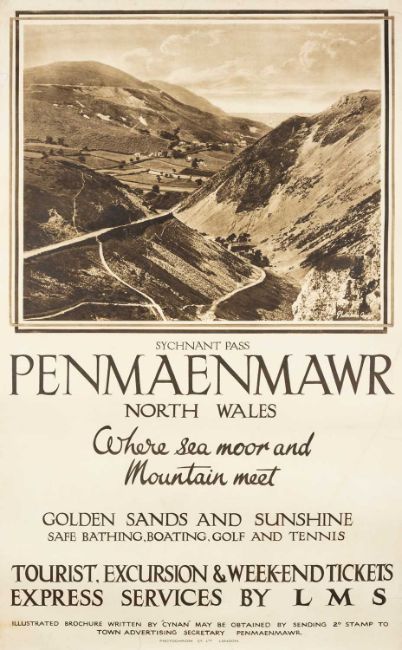 THE RAILWAY CLUB HOUSE: L.M.S. NORTH WALES TRAVEL POSTER, featuring view of Penmaenmawr (Sychnant Pass), printed by Photochrom Co. Ltd, 101.5 x 63.5cm, laid down on linen backingProvenance: private collection London.Comments: marginal tears and stain, otherwise good.