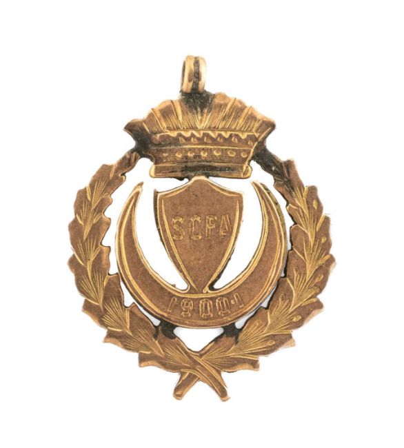 THE FOOTBALL CLUB HOUSE: 9CT ROSE GOLD MEDALLION for Welsh SCFA 1900-/01 R Morris, 4.6gms,Auctioneer's Note: believed to relate to Robert Morris, born Oswestry, 1875; died Chirk, 23 September 1926.Morris was a centre half with 6 caps: (Chirk) v England, Ireland 1900; v Ireland 1901; Scotland 1902; (Shrewsbury T) v England, Ireland 1903. Career: Chirk 1893-1902; Shrewsbury T 1902-07; Chirk 1907-09. 'Bob' Morris was said to be an excellent defender and good leader, somewhat surprisingly, never made it beyond the Birmingham and District League but was briefly on Manchester City’s books. A one-time Chirk captain, he was comfortable at left back or centre half and one writer called him “unapproachable”, adding “his defence of the ball was very uncommon”. Morris was strong in the air and was keen to go forward for corners and free kicks - an early exploiter of what is now known as the “set piece”. A careful player, he relied on his well-developed positional sense and was “entirely safe”. Morris, a brother to Jack and Charlie, captained Shrewsbury to a Shropshire Cup success in 1904 before returning to a Chirk club in decline. An official at Brynkinalt colliery, he was later chairman of the Chirk club. Honours: Shropshire Cup Winner 1903, 1904Provenance: by descent, private collection Ynys Mon, Robert & Richard Morris (vendor's mother's uncle), items in this auction believed to have belonged to Robert, but both played for Wales, Chirk FC,however Robert 'Bob' had a longer playing career
