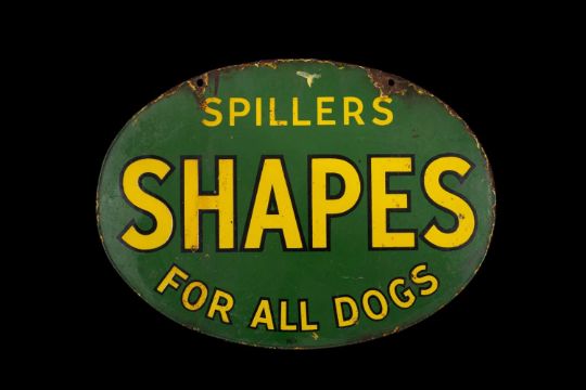 THE ADVERTISING CLUB HOUSE: VINTAGE 'SPILLERS WINALOT' ENAMEL SIGN, decorated on both sides 'The Dog's Wholemeal Food Winalot Spillers' / 'Spillers Shapes For All Dogs', oval 55cms (w)Provenance: private collection Caerphilly BoroughComments: enamel losses around suspension holes, otherwise generally good.