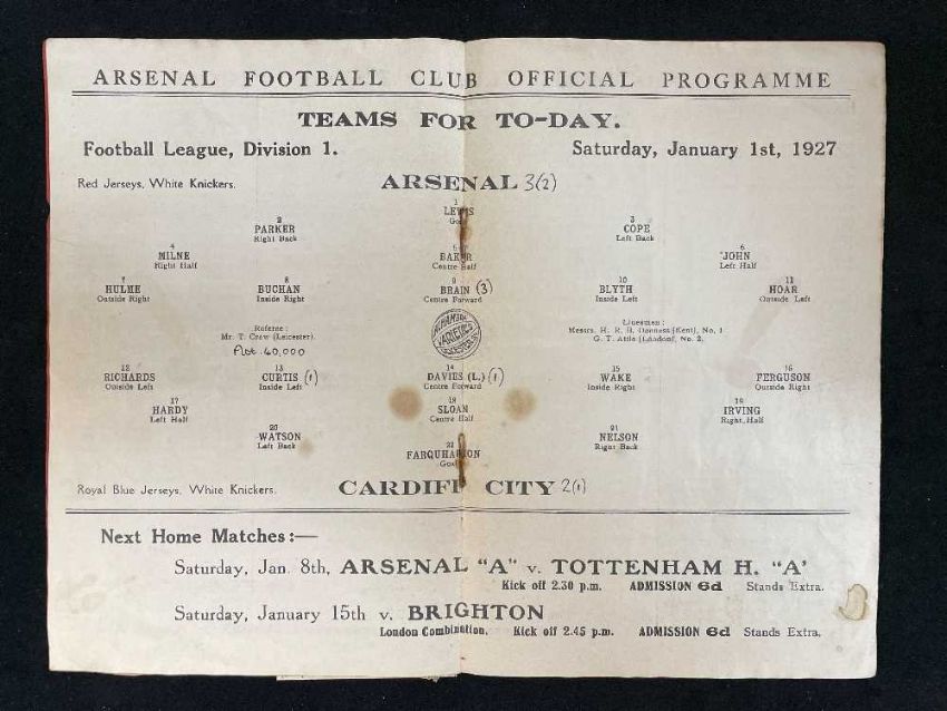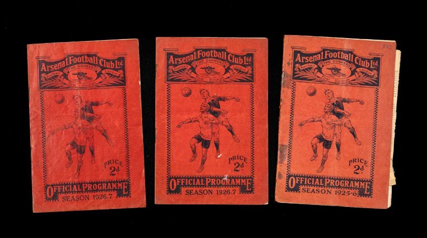 THE FOOTBALL CLUB HOUSE: THREE ARSENAL PROGRAMMES; Arsenal vs. Cardiff City dated October 17th 1925 (with associated newspaper cuttings), Arsenal vs. Leicester City dated September 11th 1926 and Arsenal vs. Cardiff City January 1st 1927 (with associated newspaper cuttings)Provenance: the collection of the former BBC Wales football commentator Richard Shepherd, please see lot 175 for further detailsComments: good overall but viewing recommended
