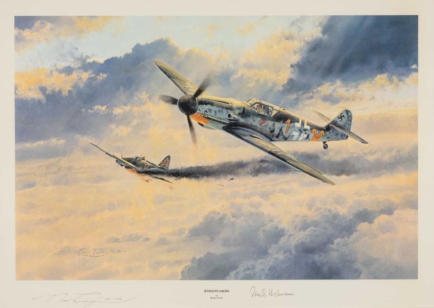 ‡ MILITARY / AVIATION CLUB HOUSE: ROBERT TAYLOR (British b.1946) limited edition (815/1250) lithograph - 'Knight's Cross', Russian and German dogfight, signed and numbered in pencil with Luftwaffe Ace Oberts Erich Hartmann KC with Oak Leaves, Swordss & Diamonds signature to margin, (I) 44 x 66.5cmsProvenance: private collection CardiffNotes: This is a rare, reasonably early Robert Taylor print and it is hard today to find examples such as this one. The print is signed by the artist, Robert Taylor and Oberst Erich Hartmann KC (1922 - 1993), also nicknamed "The Blond Knight Of Germany" by friends and "The Black Devil" by his enemies, who is the most successful fighter ace in the history of aerial combat. He claimed 352 enemy aircraft shot down (of which 345 were flown by the Soviet Air Force, and 260 of which were fighters) in 825 combat sorties while serving with the Luftwaffe, Germany's air force, in World War II. In this print, Erich Hartmann in his Me109 closes in to within 100 metres of a Russian Ilyushin II, one of his many close encounters high over the Eastern Front. Comments: framed and glazed, ready to hang