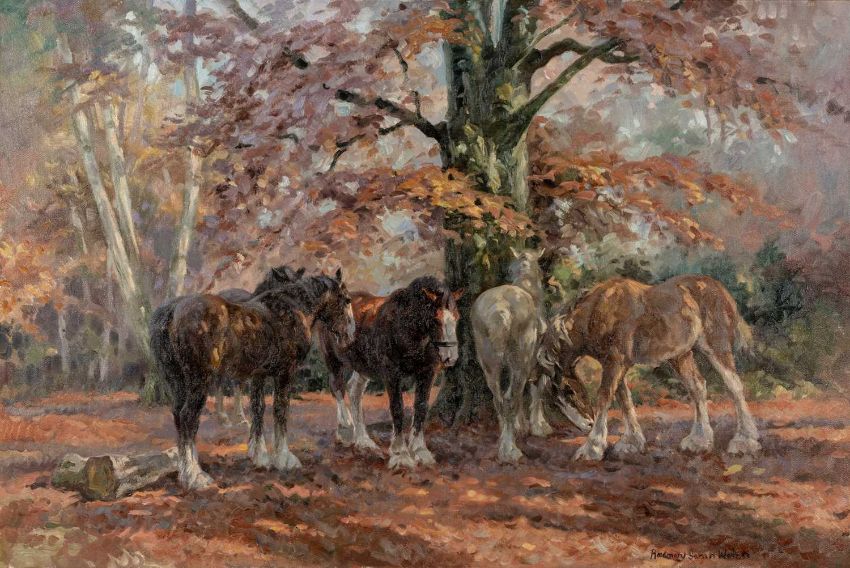‡ ROSEMARY SARAH WELCH (British, b.1946) oil on canvas - Autumn Light, four ponies foraging in woodland, possibly the New Forest, signed, 50 x 76cmsAuctioneer's Note: Welch studied at the St. Ives School of Painting under Leonard Fuller and since 1980 has focused on painting equestrian subjects. She’s a member of both the Society of Women Artists and The Society of Equestrian Artists, and has previously judged the Concours D’Elegance at the Royal Windsor Horse Show.Provenance: private collection Vale of GlamorganComments: framed ready to hang.