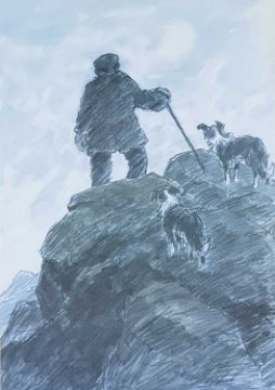 ‡ SIR KYFFIN WILLIAMS RA (Welsh 1918-2006) print - entitled verso - farmer with sheepdogs, fully signed in pencil, 53 x 36cmsProvenance: private collection ConwyComments: faded, some damage to top right corner, framed and glazed