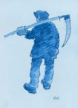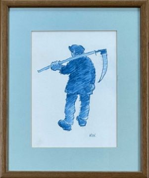‡ SIR KYFFIN WILLIAMS RA facsimile printed greetings card - farmer holding a scythe, printed initials, inscribed verso 'Nadolig Llawen', fully signed in pen, 20 x 14cmsProvenance: private collection ConwyComments: faded, framed and glazed