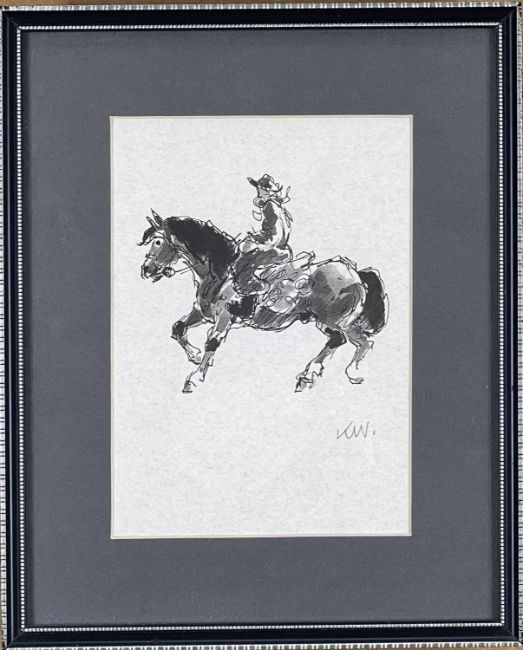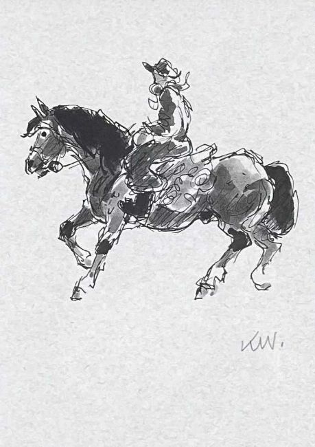 ‡ SIR KYFFIN WILLIAMS RA (Welsh 1918-2006) facsimile print - Gaucho on horseback, signed with initials in pencil, 17.5 x 12cmsProvenance: private collection ConwyComments: foxing present, framed and glazed