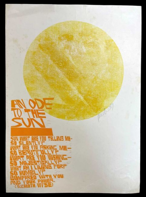 ‡ PAUL PETER PIECH (1920-1996) two colour woodcut print - poem by Elizabeth Wyse, 'An Ode to the Sun...', signed and dated 1993, 62 x 45cmsProvenance: private collection NetherlandsComments: foxing, unframed