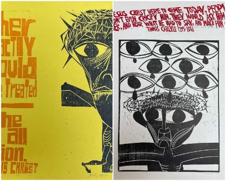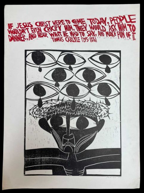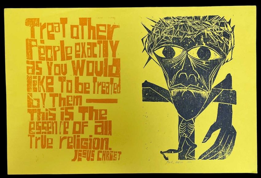 ‡ PAUL PETER PIECH (American-Welsh 1920-1996) two woodcut prints - limited edition (54/150) two colour print with quote from Jesus Christ, 'Treat Other People as You Would Like to be Treated..', signed and dated 1970, 43 x 64cms together with another limited edition (19/75) print with quote from Scottish historian and philosopher Thomas Carlyle, signed and dated 1972, 76 x 56cmsProvenance: were gifted by the artist to the Bertrand Russell Peace Foundation, proceeds will help pay for renovations of Russell's old home in CornwallComments: unframed