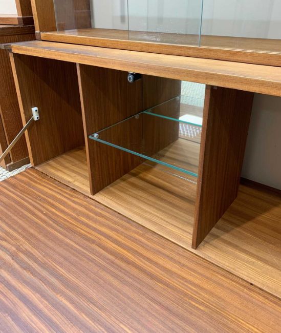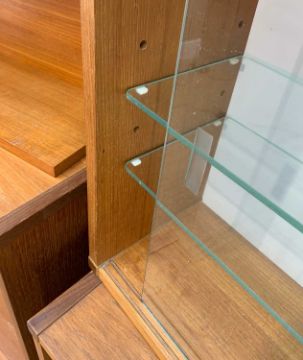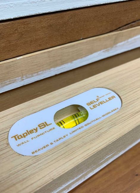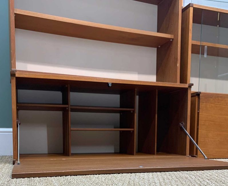 MID-CENTURY TEAK BEAVER & TAPLEY SL FLOATING WALL UNITS comprising, two glazed sliding-door wall cupboards, one with two glass shelves, the other with one wooden shelf, 51 (h) x 81 (w) x 22cms (d), drinks cabinet, drop-flap front with partitioned interior, mirror-backed central section with glass shelf, 37 (h) x 81 (w) x 37cms (d), open bookcase with single wooden shelf, 56 (h) x 92 (w) x 26cms (d), magazine shelf, 38 (h) x 81 (w) x 22cms (d), bureau/desk, drop-flap front, partitioned interior, 9 x SL batons (15)Provenance: private collection Vale of GlamorganAuctioneers notes: ladder-free design by Robert Heritage, first introduced by Beaver & Tapley in 1961 and superseded in 1978 by the Tapley 33 system introduced three years earlier. Each unit is supported using a concealed fixing baton, each with their own spirit level (hence SL)Comments: slightly faded, some stains & water marks, light bumps marks, internal damage to bureau, one baton split, some decorating over-paint, inspection advised