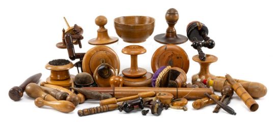 ASSORTED CLOTHING CARE & REPAIR TREEN, including darning mushrooms, wool bowl, thread holder, tape measures, needle cases, spinning spindles, two sewing clamps, circular embroidery frames, prickers, laundry markers, finger darners etc. (qty)Provenance: the Karl Johansen (1937-2021) Collection, by family descent