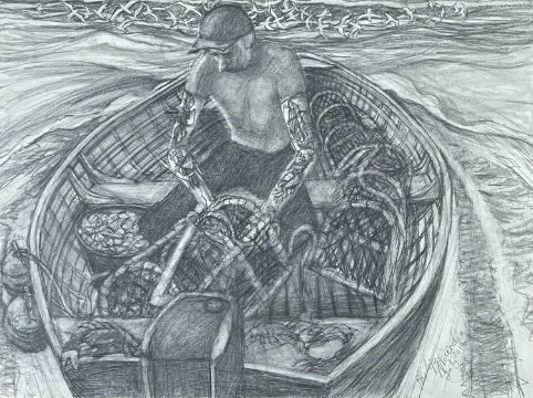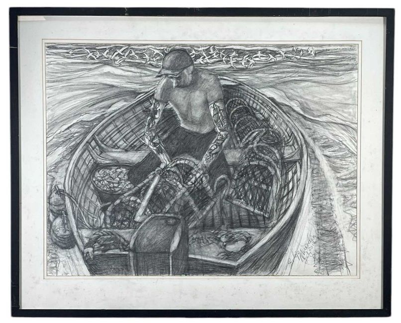 ‡ PHILIP MUIRDEN (1932-2023) pencil on paper - entitled verso, 'Lobster Man', signed and dated 2014, 58 x 75cmsAuctioneers Note: Philip Muirden was born in Pembrokeshire and educated at Haverfordwest Grammar School. He went on to study at Cardiff College of Art before completing a Master’s Degree at The Royal Academy of Art. Philip became a lecturer at Mansfield College of Art from 1965 to 1972 and a Senior Lecturer at Newport College of Art from 1972 to 1991. A draughtsman of the very highest order, Philip’s drawings of marine subjects are both breath-taking and brilliant in their observation and what he described as ‘retinal experience’. There is a strong surreal element to his paintings, showing very imaginative and poetic handling with what he termed ‘considerations of surreal and social themes’. During his life as an artist Philip Muirden always avoided the production of works with a unified, pre-conceived brand image. His output contains celebrations of his ‘retinal images’, such as the wonderful fishing boat subject matter he painted. His intellectually inspired work and reflections on the human condition were frequently presented.Provenance: decreased estate, PembrokeshireComments: framed, glazed