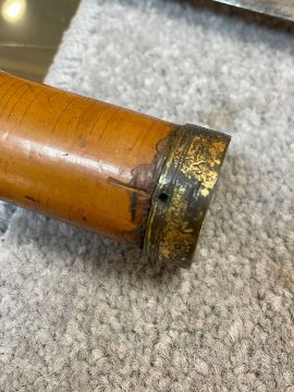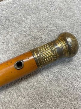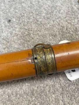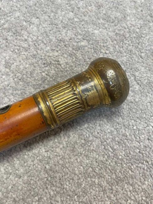 GEORGIAN MALACCA CANE SWORD STICK, with gilt handle and collars, copper ferrule, push release, containing fullered steel blade.Provenance: private collection Vale of GlamorganComments: Buyer must over the age of 18. Splits on malacca, blade with blemishes, collars loose, gilt worn, handle dents.