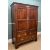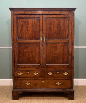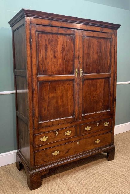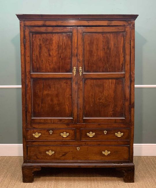 18TH CENTURY YEW CUPBOARD, cornice above two-door cupboard, shelved inner, two short over one long drawer, brass 'bat-wing' drawer pulls, raised on tall bracket feet, 183 (h) x 127 (w) x 54cms (d)Provenance: with Richard Bebb; private collection WiltshireComment: fine colour and patina, plinth/feet with old worm damage, warped drawer fronts, various splits, drawer handles incomplete, one piece