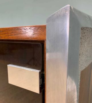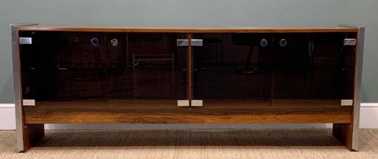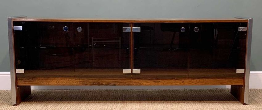 RICHARD YOUNG FOR MERROW ASSOC: ROSEWOOD & POLISHED METAL SIDEBOARD, mid-century modern, textured metal side supports, smoky glass doors with chrome hinges and knobs, adjustable glass shelves within, 70 (h) x187 (w) x 46cms (d)Auctioneer's Note: Merrow Associates was established in the early 60’s by Richard Young who was inspired by Danish design, luxurious materials, fine wood finishes and ingenious engineering. Their furniture was available at Harrods, Heals, Oscar Woollens and other high-end retailers in the USA, Germany, France and Europe. Merrow furniture gained popularity in the residential market, corporate spaces and in the homes and ownership of celebrities, one of the most recognisable pieces was comedian Ronnie Corbett’s famous 'long joke' chair!Provenance: private collection CardiffComments: no apparent damage, inspection advised, CITES certificate 24BGA10MLN621