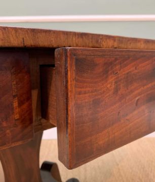 THREE ANTIQUE MAHOGANY TABLES including, LATE REGENCY MAHOGANY CROSSBANDED SOFA TABLE, two full length frieze drawers, concave platform, splayed legs with brass lions paw caps, brass castors, 72 (h) x 89 (w) (144 extended) x 66cms (d), top stained, water marks, scratched, minor splits to veneer, drop flap veneer repair, LATE REGENCY MAHOGANY CROSSBANDED SOFA TABLE, two full-length frieze drawers with dummy opposites, twin baluster stems on concave platform, splayed, box-strung legs, brass lions paw capping with brass castors, 71 (h) x 100 (w) (150 extended) x 76cms (d), top stained, old scratches/bumps etc, veneer repairs, REGENCY MAHOGANY PEMBROKE TABLE, ebony banding, frieze drawer with dummy opposite, circular brass handles, nicely turned pedestal, splayed legs, brass caps, brass castors, 73 (h) x 92 (w) x 52cms (w) (95 extended), good colour, bumps and scratches (3)Provenance: private collection CardiffComments: as above, inspection advised, please note first image of combined furniture not to scale, check measurements listed