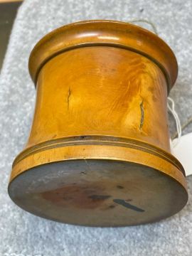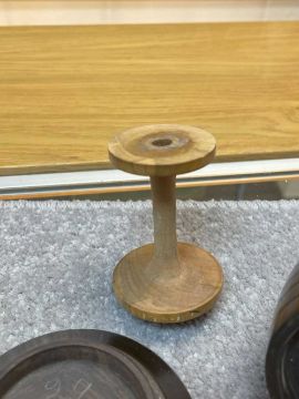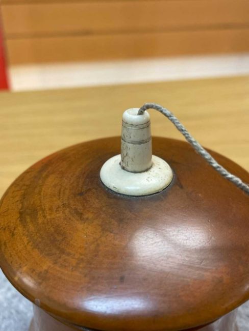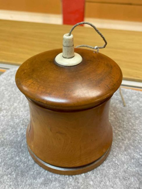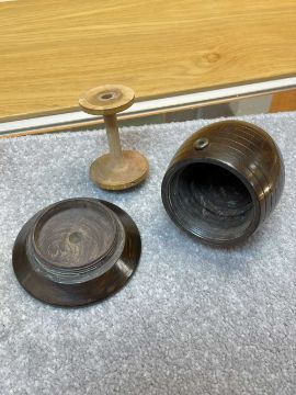 TWO TREEN STRING BOXES, comprising a lignum vitae and ivory mounted beehive string box, and a fruitwood string box with bone finial, largest 11cms h (2)Provenance: the Karl Johansen (1937-2021) Collection, by family descent