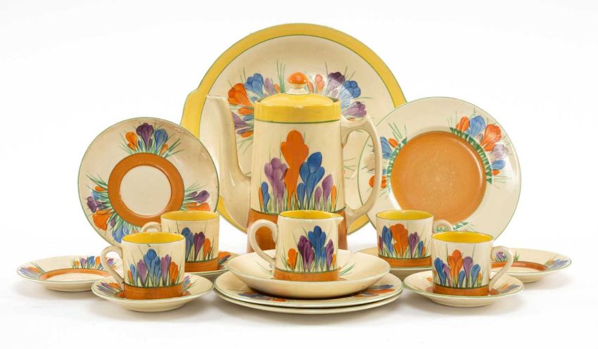 CLARICE CLIFF 'CROCUS' PART COFFEE SET, of Tankard shape, comprising coffee pot, 4 coffee cans, 6 saucers, cream jug, all with Bizarre marks; together with associated breakfast saucers, tea plates, and bread & butter plate, all with Royal Staffordshire marks (18)Provenance: private collection Comments: chips and cracks to 2 R.Staffordshire tea plates and 1 breakfast saucer.