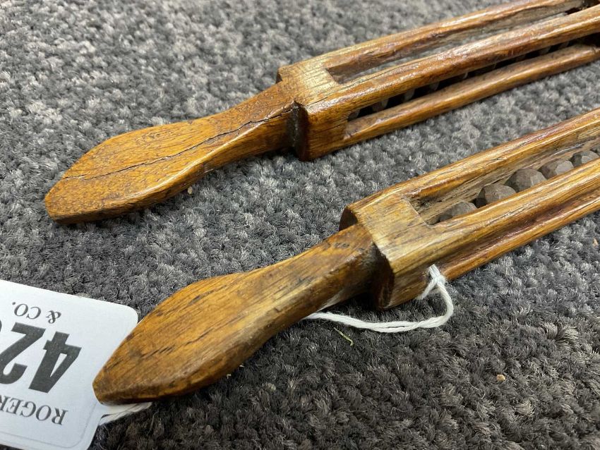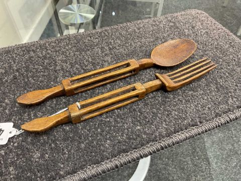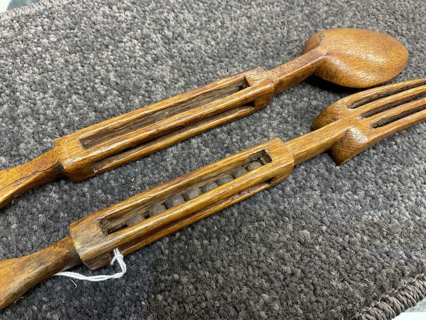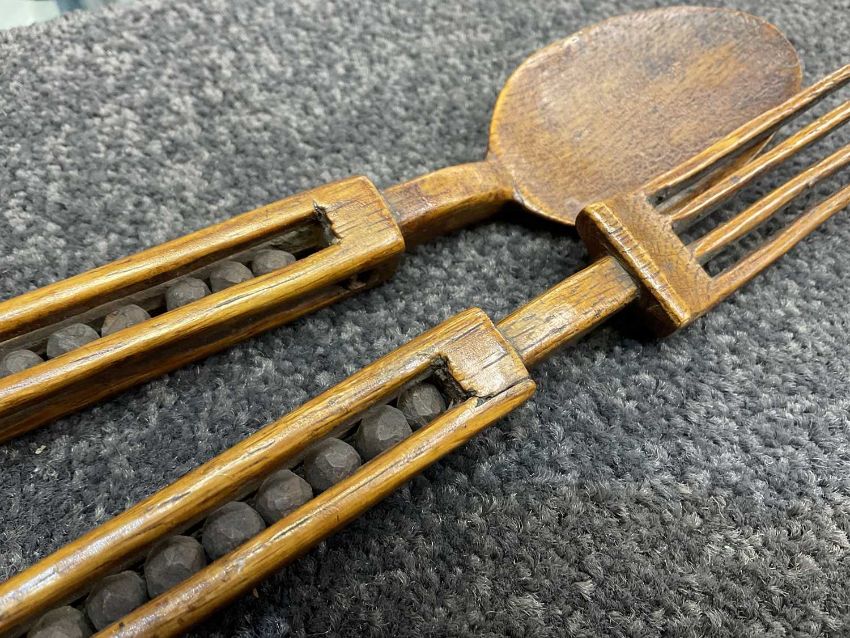 WELSH TREEN SPOON & FORK with caged ball handles, 24cms (h) (2)Provenance: the Karl Johansen (1937-2021) Collection, by family descent