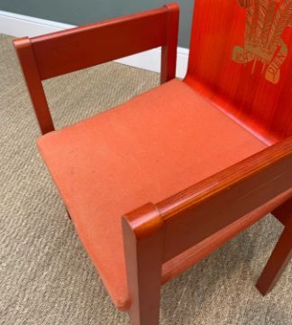 1969 PRINCE OF WALES INVESTITURE CHAIR, designed by Lord Snowdon and manufactured by Welsh Remploy factories in stained beech and plywood with olive ash, embossed with Prince of Wales feathers motif in gold leaf, 79cms (h)Provenance: private collection AngleseyComments: upholstery stained, foam padding crystalised, bumps/nicks to arms