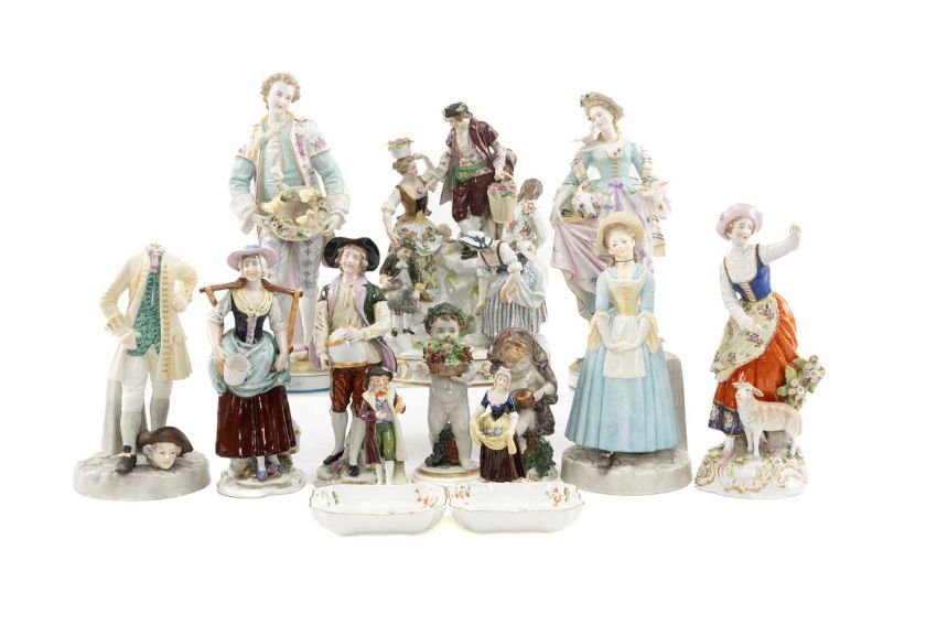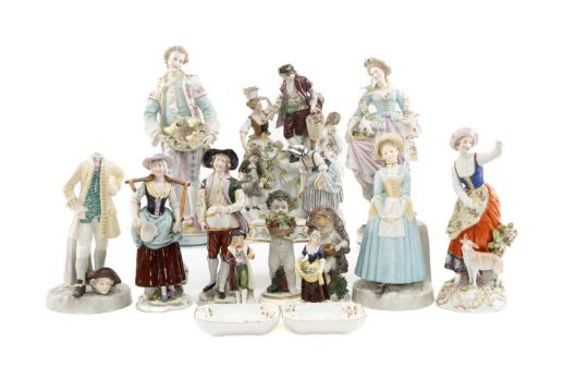 ASSORTED GERMAN PORCELAIN FIGURINES, including Meissen style allegorical figural group of ‘farming’, pair Sitzendorf figures of rustics, pair of Naples style figures of milkmaid and companion, pair of Royal Worcester figures ‘Gallant’ and ‘Gallant’s Lady’ (one with reglued head) etc. (12)Provenance: private collection CardiffComments: chips and nicks, minor restoration, inspection advised