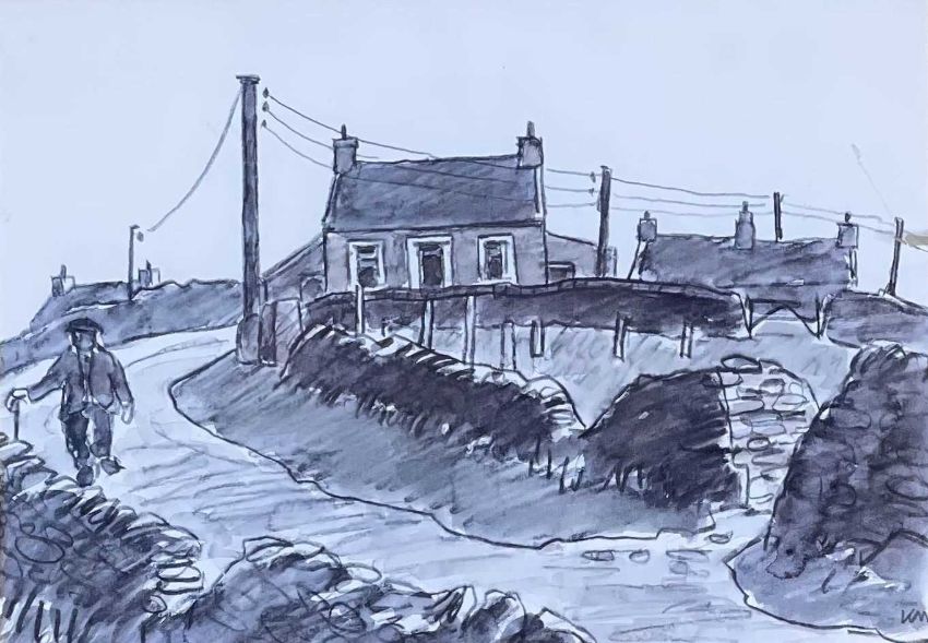 ‡ SIR KYFFIN WILLIAMS RA (Welsh 1918-2006) facsimile print - farmer walking through village lane with drystone walls, printed initials, 14 x 20cmsProvenance: private collection ConwyComments: faded, framed and glazed