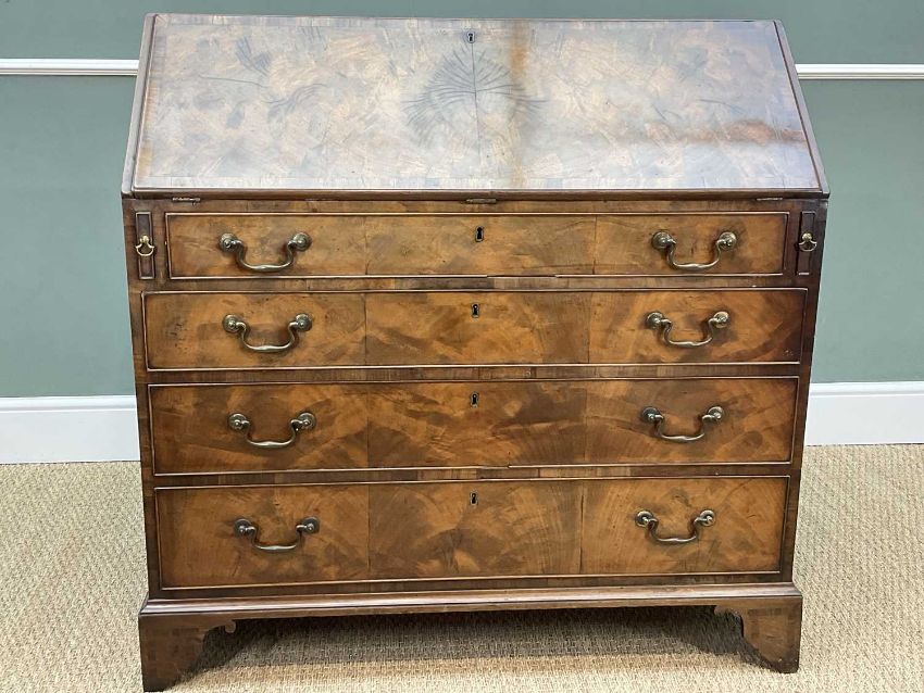 GOOD EARLY 19TH C. FLAME MAHOGANY BUREAU, angled fall enclosing fitted interior of pigeon holes, drawers and cupboard, four graduated long drawers, crossbanded bracket feet (chamfered), 108 (h) x 107 (w) x 53.5cms (d)Provenance: deceased estate Cardiff.Comments: interior cupboard door missing section of veneer, some losses to cockbeading, bracket feet chamfered.