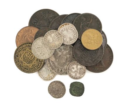 ASSORTED ANTIQUE COLLECTABLE COINS including 1860 one penny, 1844 & 1854 penny, 1781 Louis XVI sol, 1827 Austrian 20 kreuzer, 1887, 1888 & 1890 half penny, 1835 East India Co half anna, 1816 ein kreuzer, 1804 Island of Sumatra coin, maroc 50 francs, Victorian 3 pence pieces, believed 1544 Austrian Ferdinand I pfennig of kremnitz, believed Charles I rose farthing etc.Provenance: private collection Vale of GlamorganComments: wear overall, dints, viewing recommended