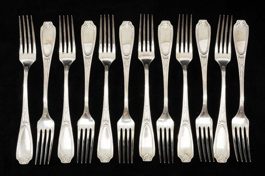 SET OF TWELVE WHITE METAL TABLE FORKS, marked 'Erhardt' and '100' (12)Provenance: private collection YorkshireComments: wear overall, viewing recommended