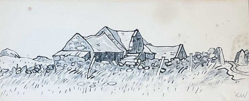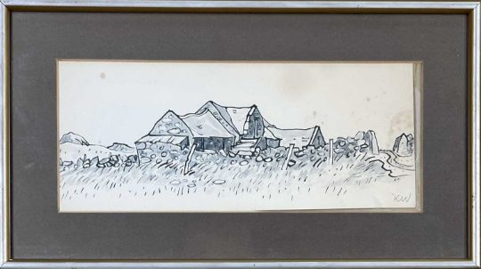 ‡ SIR KYFFIN WILLIAMS RA print - entitled verso 'Tyddyn Llawydan ger Trefri', signed with initials in pencil, 11 x 27cmsProvenance: private collection ConwyComments: print has slipped under mount, faded with foxing present, framed and glazed