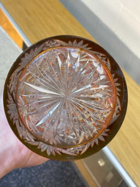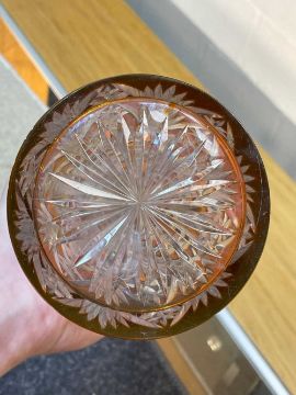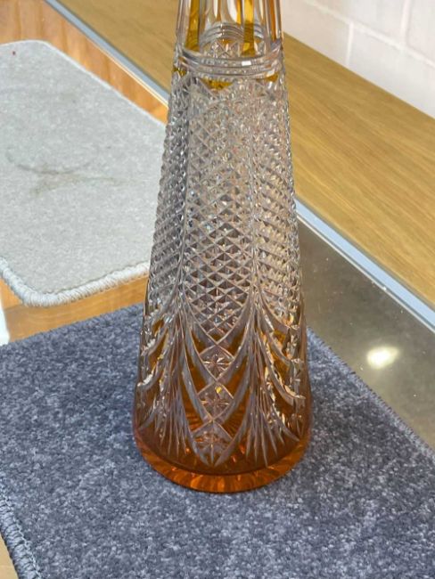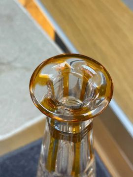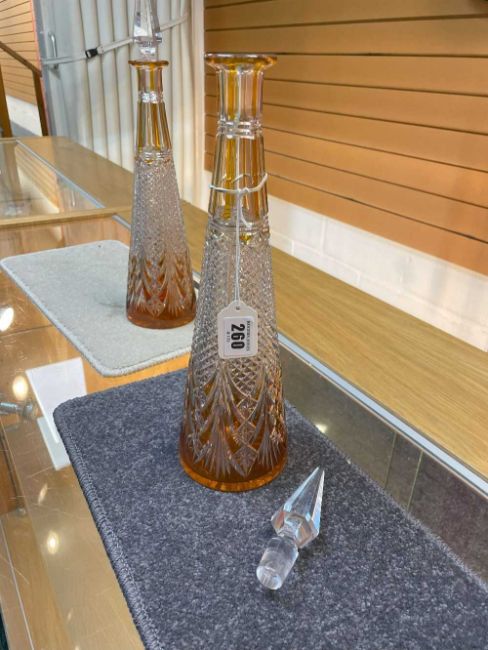 PAIR OF BACCARAT STYLE CONICAL TAPERING DECANTERS, clear with amber overlay, pyramid stopper, 42cms (h) (2)Provenance: private collection CarmarthenshireComments: minor nibbles to tops of stoppers, wear, viewing recommended