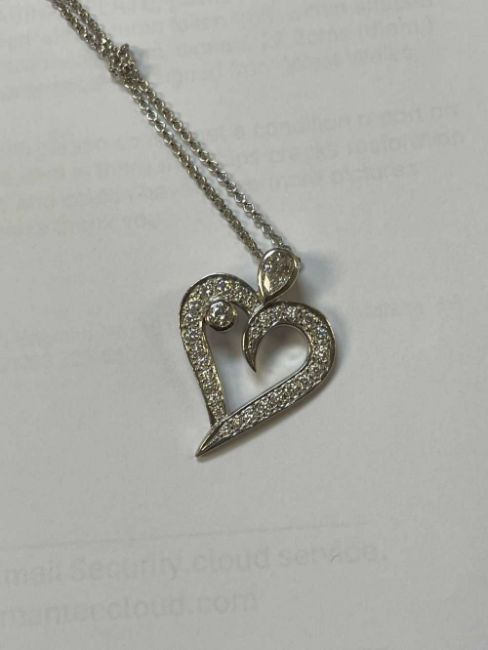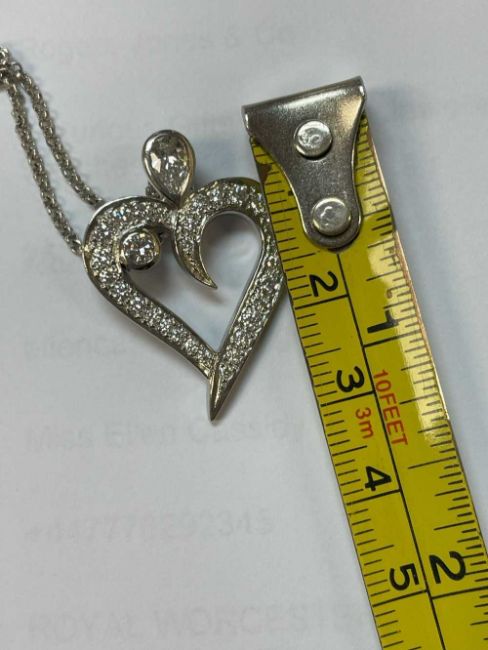 PLATINUM DIAMOND ENCRUSTED HEART PENDANT, the two principal stones measuring 0.4-5cts overall approx., set with a further 28 graduated diamonds, on an 18ct white gold chain, 13.1gms in The Clock Shop of Porthcawl boxProvenance: private collection Bridgend County BoroughComments: inclusions, all stones present, viewing recommended Condition Report:The size is 2.5cms across, 3cms top to bottom.