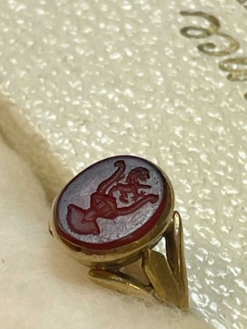 GROUP OF 9CT GOLD JEWELLERY comprising 9ct gold band, 9ct gold emerald and diamond chip ring, 9ct gold carnelian intaglio ring, 9ct gold peridot brooch, 10.2gms gross, together with yellow metal tie clip (5)Provenance: private collection CardiffComments: wear overall, inclusions, misshapen in places, viewing recommended