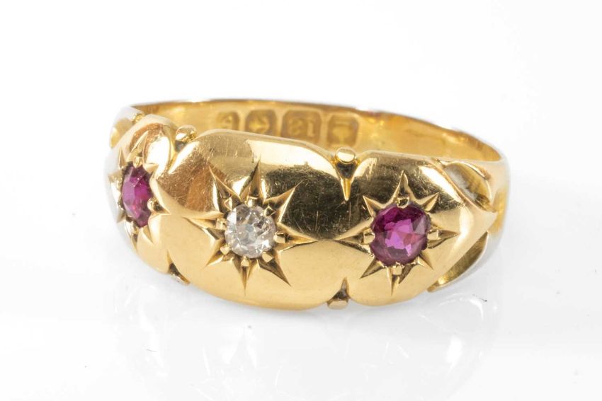 ANTIQUE 18CT GOLD RUBY & DIAMOND THREE STONE RING, Birmingham 1906, ring size L 1/2, 2.5gms in Stoodley & Son ring boxProvenance: private collection PembrokeshireComments: light wear overall, viewing recommended