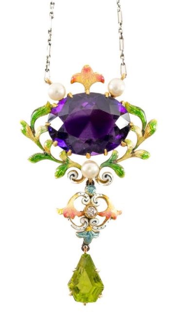ATTRIBUTED TO THOMAS WORDLEY LTD: FINE 19TH C. AMETHYST, PERIDOT, DIAMOND, PEARL & ENAMEL PENDANT, mounted in unmarked yellow metal presumed gold, on later white metal chain, 5cms (h)Provenance: private collection PenarthNotes: Thomas Wordley Ltd. were located at 4 St. Swithen's Lane, London E.C.Comment: some v. minor chips/losses to enamel, chain associated.