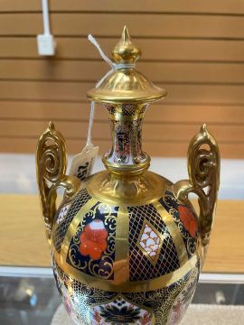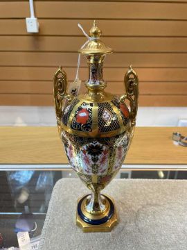 ROYAL CROWN DERBY '1128' PATTERN OVIFORM URN, with high scrolled twin foliate handles, on socle base, 41cms (h)Provenance: consigned from West WalesComments: excellent