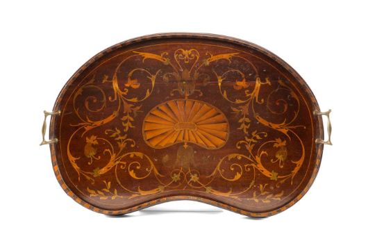 EDWARDIAN MARQUETRY KIDNEY-SHAPED TRE TRAY, with brass handles, inlaid with scrolling acanthus and central shell patera, raised gallery, 63cms (w)Provenance; deceased estate RCTComments: base slightly bowed, minor restoration, some cracks to gallery.