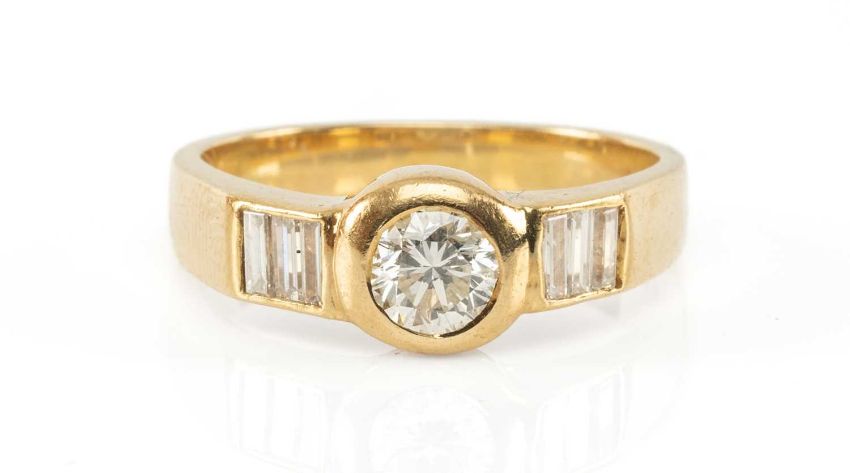 18CT GOLD DIAMOND RING, central round brilliant cut stone in rubover setting supported by six baguette diamonds to the shoulders, principal stone approx. 0.5ct, 6.0gmsProvenance: private collection GlamorganComments: ring size R, unmarked but tests as 18ct