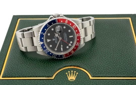 ROLEX GMT-MASTER II DATE STAINLESS STEEL WRISTWATCH, ref. model 16710, serial number F234XXX, circa 2004, black dial, date aperture at 3 o'clock, luminous dot and baton hour markers, 'Mercedes' hands with luminous inserts, centre seconds, minute track, bi-directional rotating 'Pepsi' bezel, oyster bracelet numbered 78790A, GMT-Master booklet, green Rolex oyster booklet, guarantee certificate, purchase receipt and valuation from Armour-Winston Ltd both dated 22/06/2014, in Rolex box and outer boxProvenance: private collection Pembrokeshire since 2014Comments: fine example in excellent condition, light wear, some scratches to bracelet commensurate with age, seldom worn, ticking, viewing highly recommended