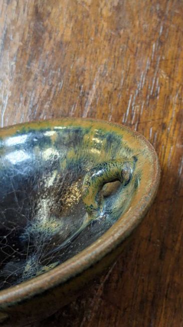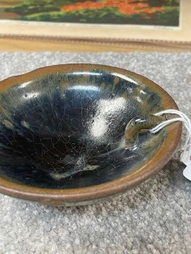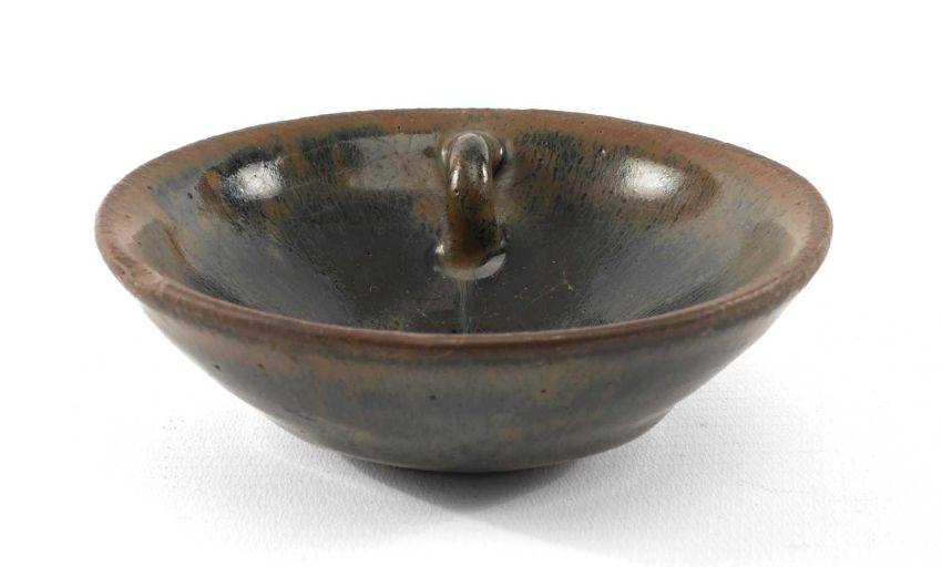 CHINESE JIAN YAO BOWL, Song Dynasty or later, with rare inner loop handle, 10cms (diam.) x 3.3cms (h)Provenance: private collection PowysComment: base with glaze drips polished off, rim with firing fault under the glaze.