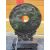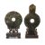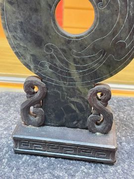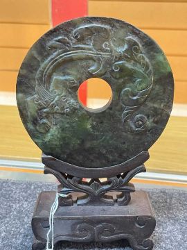 TWO CHINESE GREEN HARDSTONE ARCHAISTIC BI DISCS, one of conventional ring form, carved on one side in low relief with a chilong, 12cms (diam.), the other of spearpoint form, incised with chilong on both sides, 21.5cms (h), both on wood stands (2)Auctioneer's Note: Bi discs have been produced since the Neolithic period and were often found buried with the dead. Though their purpose is unknown, later texts thought that bi were representations of heaven.Provenance: private collection GwyneddComments: one stand reglued, one stand with small chip only