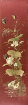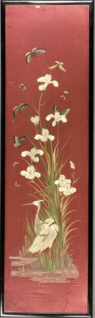 PAIR CHINESE RED SILK EMBROIDERIES, c. 1920, depicting pairs of mandarin ducks and egrets, symbolic of marital harmony, 111cms (h) (2)Provenance: private collection ConwyComments: silk slightly faded, abrasions, framed, glazed