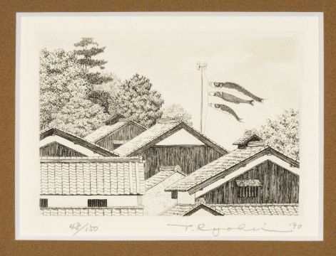 RYOHEI TANAKA (1933-2019) limited edition (48/150) etching - building beneath koinobori, signed, numbered and dated '90 in pencil, (pl) 7.5 x 10.5cmsProvenance: private collection SomersetComments: good overall, mounted but unframed.