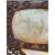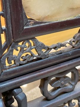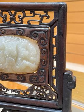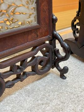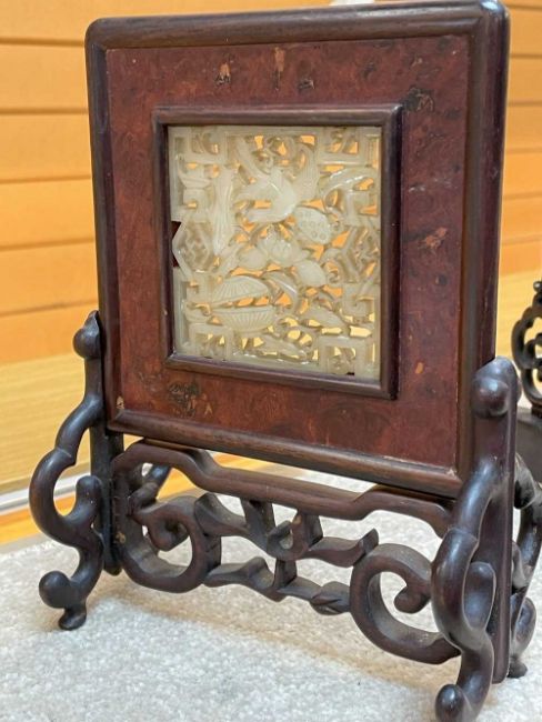 TWO CHINESE JADE & HARDWOOD TABLE SCREENS, one containing carved dragon plaque within filigree frame, the other filigree jade plaque depicting birds and scrolling foliage within burr wood frame, the largest 21cms (h)Provenance: private collection GwyneddComments: some losses to lower stand