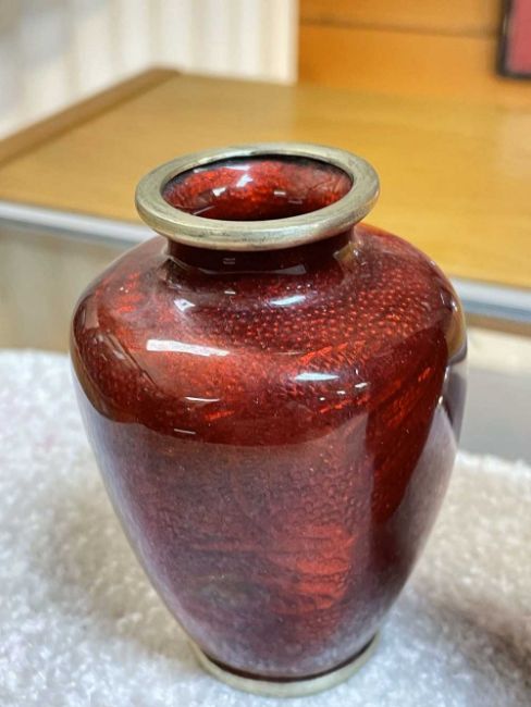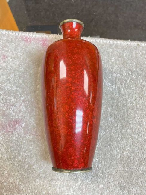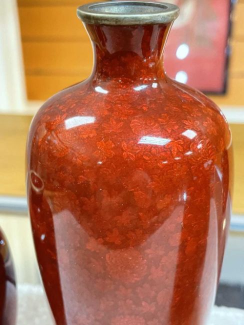 FOUR JAPANESE GINBARI ENAMEL BOTTLES, all with deep red glazes over foiled bases, largest 15cms (h) (4)Provenance: private collection GwyneddComments: one vase with repaired foot Condition Report:The damaged vase is the squarer smaller vase (far right in the main photograph)The same vase with the repair has a cracked body, all other three look fine.