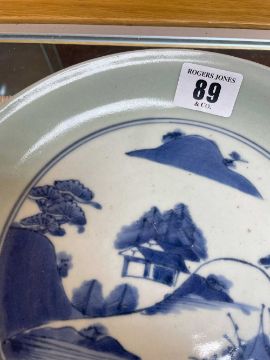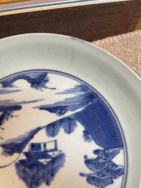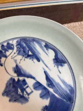 JAPANESE ARITA BLUE & WHITE SAUCER DISH, 18th Century, centre painted with landscape within celadon border, base with six-character Chenghua mark and five stilt marks, 21cms (diam.)Provenance: private collection DenbighshireComments: good overall condition