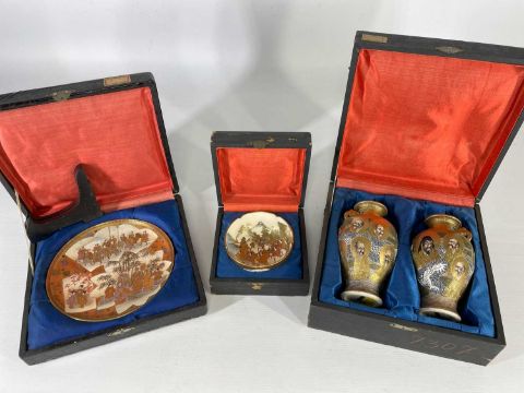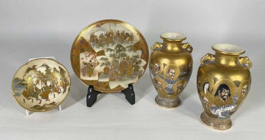 ASSORTED JAPANESE SATSUMA POTTERY, Taisho/early Showa Era, comprising small dish decorated with shaped panels of sages reading scrolls, yamato nadeshiko and samurai procession, 8.6cms (diam.); small bowl with indented rim, decorated with procession of samurai with palanquin in a Fujiyama landscape, 11cms (diam.); and pair of oviform vases decorated with rakan, 15cms (h), all with 2/3 character marks, boxed (4)Provenance: private collection CarmarthenComment: all good.